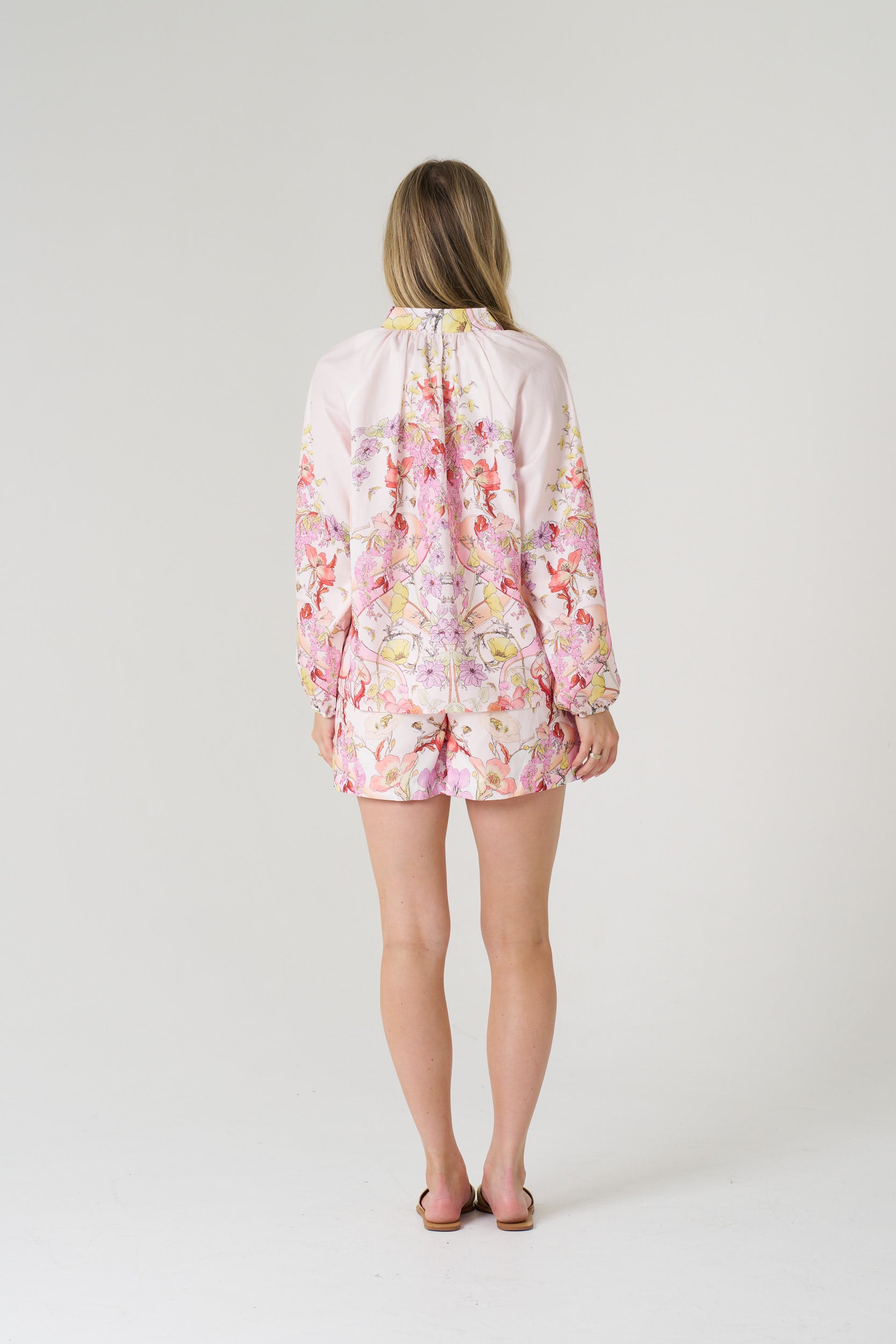 The long-sleeve blouse features a relaxed silhouette with gathered cuffs and a refined button-front neckline, allowing it to be worn tucked, half-tucked or loose. The matching shorts are finished with a comfortable elastic waistband and a gently flared shape, creating a balanced and flattering fit.