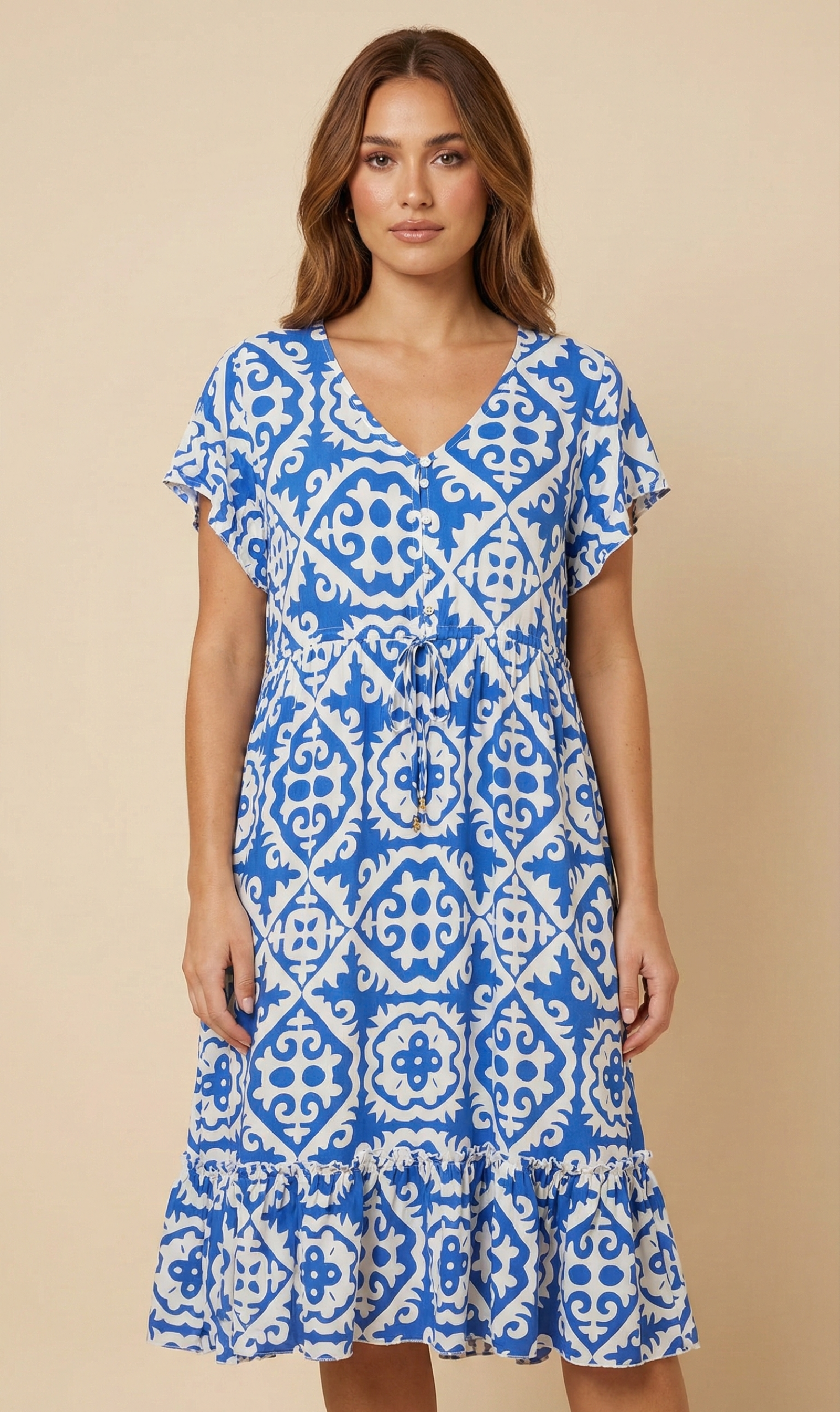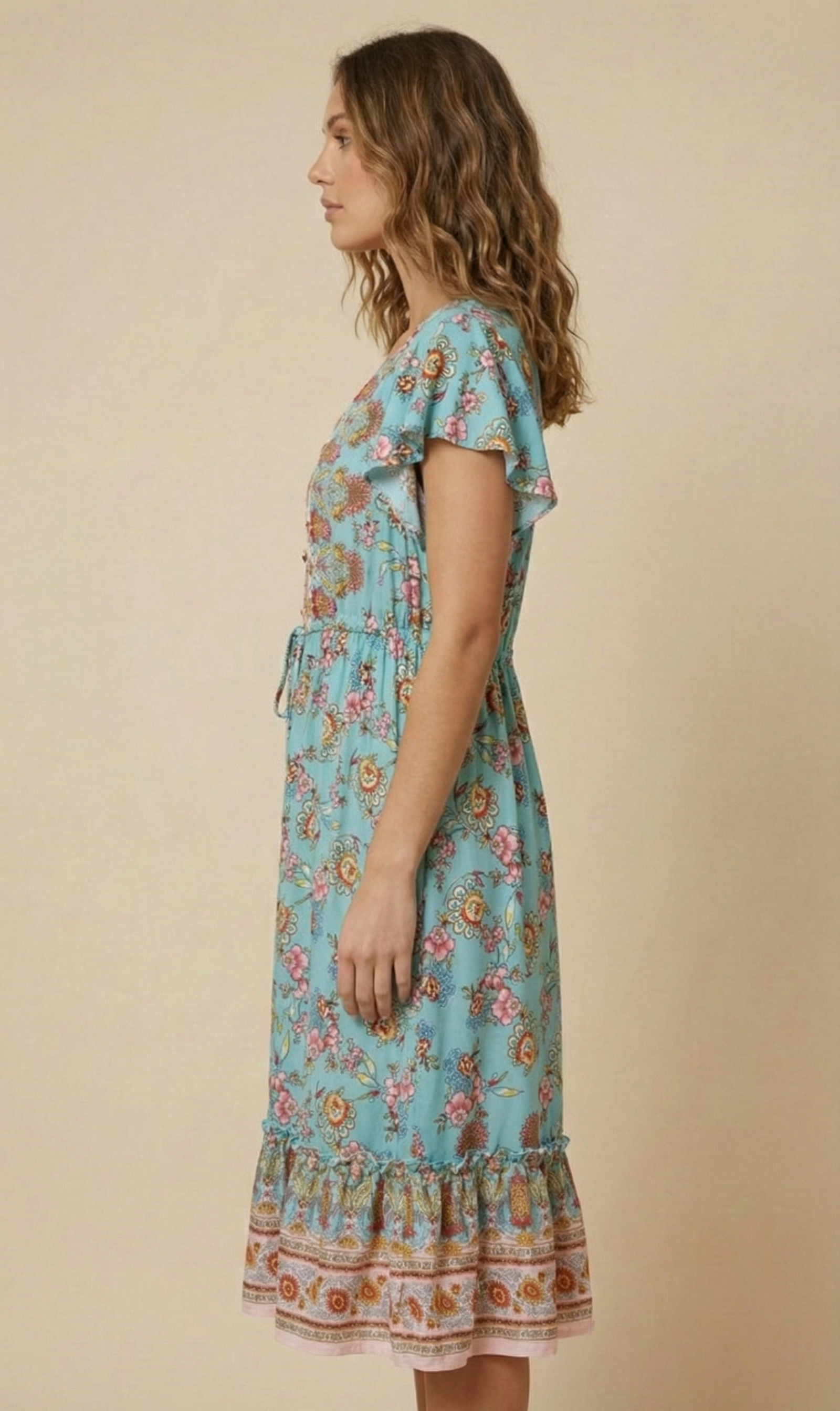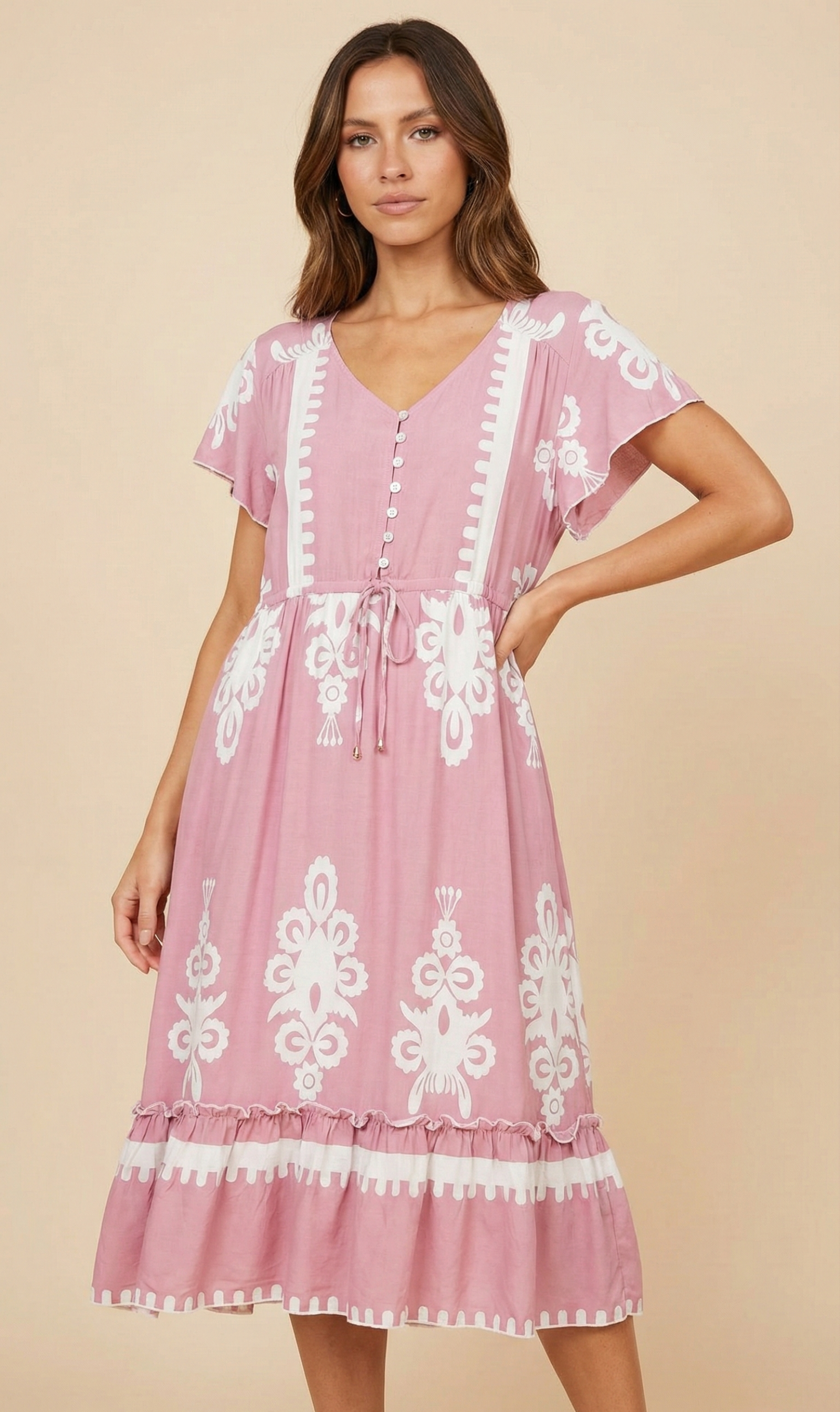 Romantic and easy-wearing, the Summer Breeze Boho Dress is designed for relaxed warm-weather days. Crafted from soft, breathable 100% rayon, it features a flattering V-neckline with button detailing, an adjustable drawstring waist, and flutter sleeves that add gentle movement. The tiered hem creates a breezy silhouette that flows beautifully with every step. Available in five unique prints—from vibrant florals to bold artisan motifs—this dress is your effortless go-to for summer outings, travel and everyday comfort.