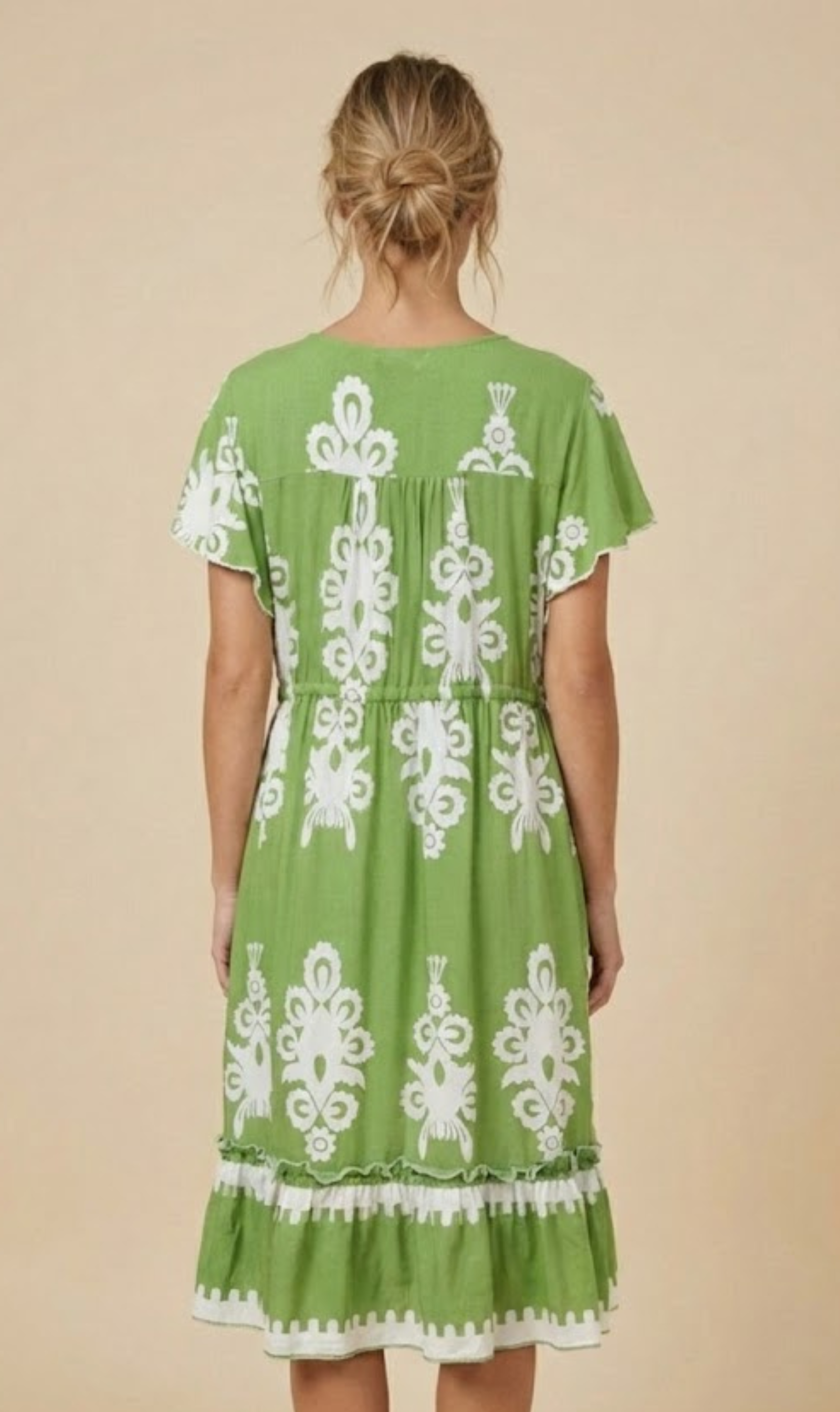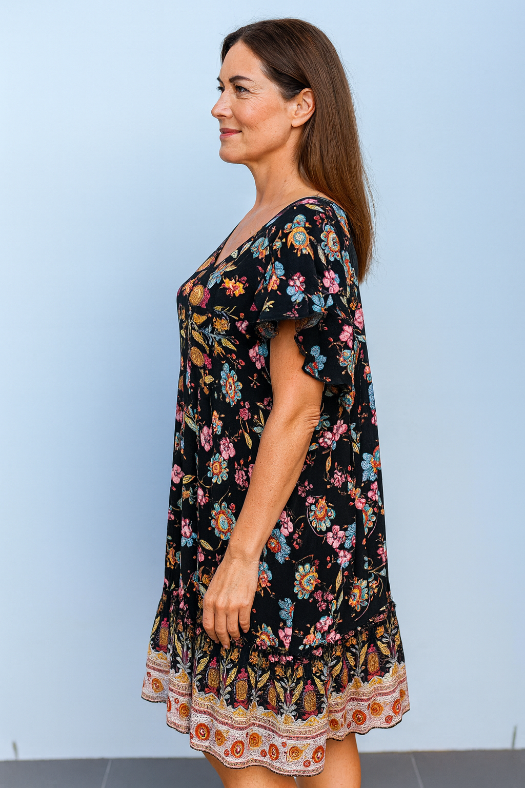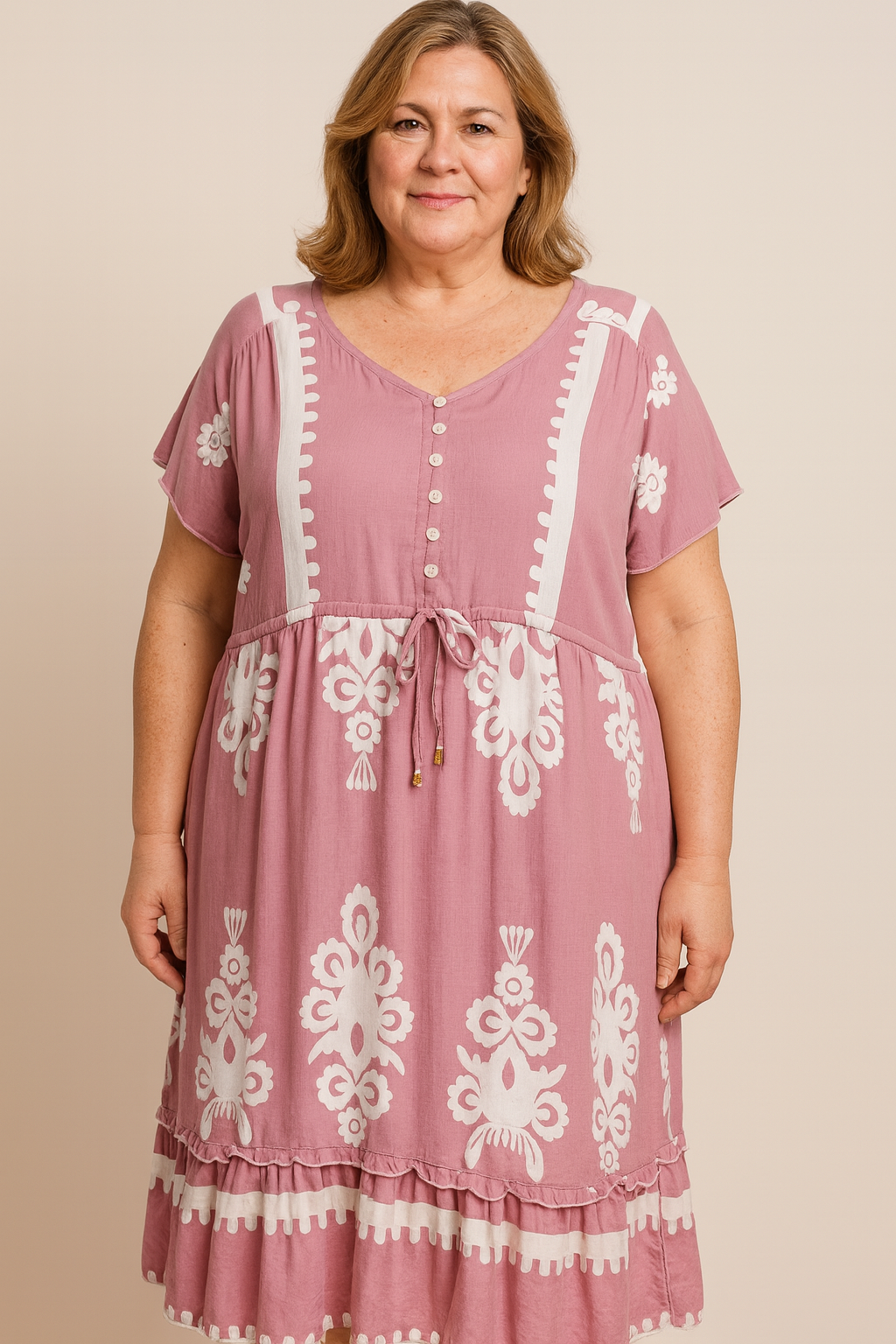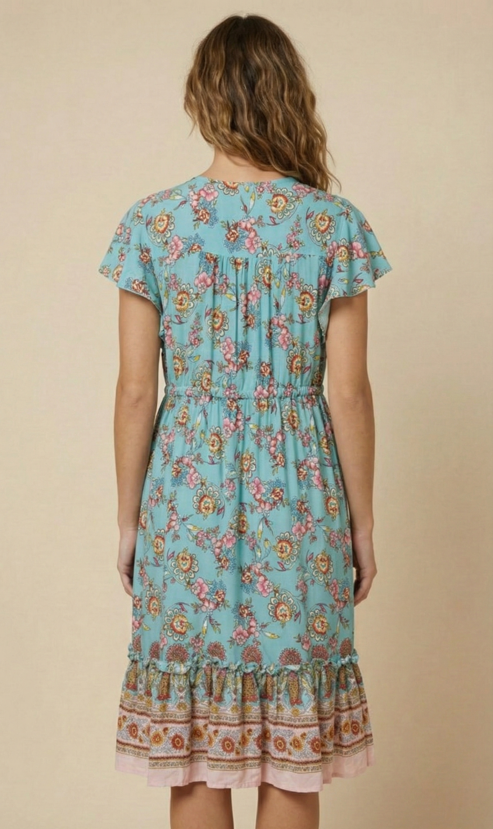 Romantic and easy-wearing, the Summer Breeze Boho Dress is designed for relaxed warm-weather days. Crafted from soft, breathable 100% rayon, it features a flattering V-neckline with button detailing, an adjustable drawstring waist, and flutter sleeves that add gentle movement. The tiered hem creates a breezy silhouette that flows beautifully with every step. Available in five unique prints—from vibrant florals to bold artisan motifs—this dress is your effortless go-to for summer outings, travel and everyday comfort.