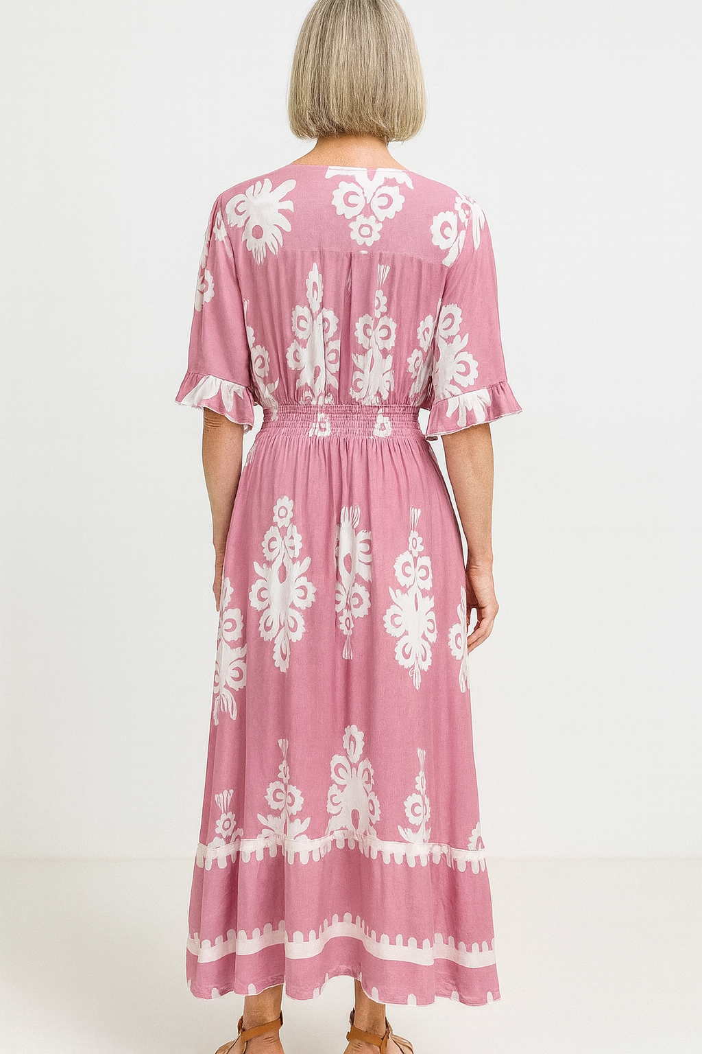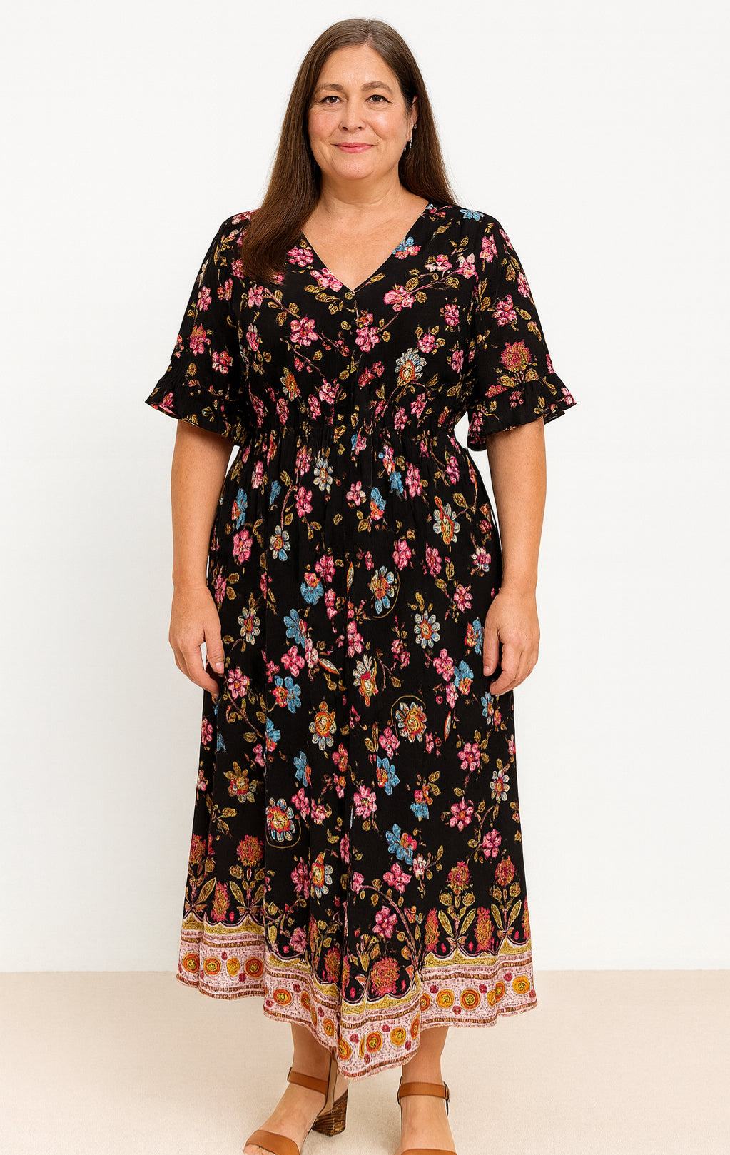 Elegant and easy to wear, the Sunset Breeze Maxi Dress brings relaxed boho charm to every warm-weather occasion. Crafted from soft, breathable 100% rayon, it drapes beautifully through the body while offering all-day comfort. The V-neckline with button detail, softly flared sleeves and a gathered waist create a flattering silhouette, flowing into a tiered maxi skirt that moves effortlessly with each step. Available in five unique prints—from vibrant florals to bold artisan motifs—it’s the perfect throw-on style for weekends, dinners, holidays and everything in between.